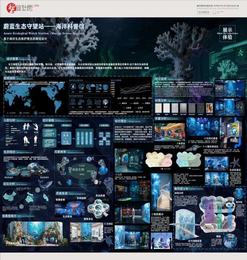 从品牌全案策划到沉浸式会展设计,从社交媒体传播到用户体验优化,每一件作品都源于对真实项目的深度拆解:或聚焦本土企业的品牌升级需求,通过AI数据分析精准定位目标客群;或依托虚拟仿真技术搭建数字化会展空间,用算法优化动线设计与交互逻辑;或借助生成式AI工具拓展视觉表达边界,在效率与创意的平衡中探索设计新范式。同学们以开放的姿态拥抱技术,却从未让工具定义创意的温度,它们不仅是对四年专业学习的成果检验,更是新一代广告与会展人面向行业交出的“能力宣言”。