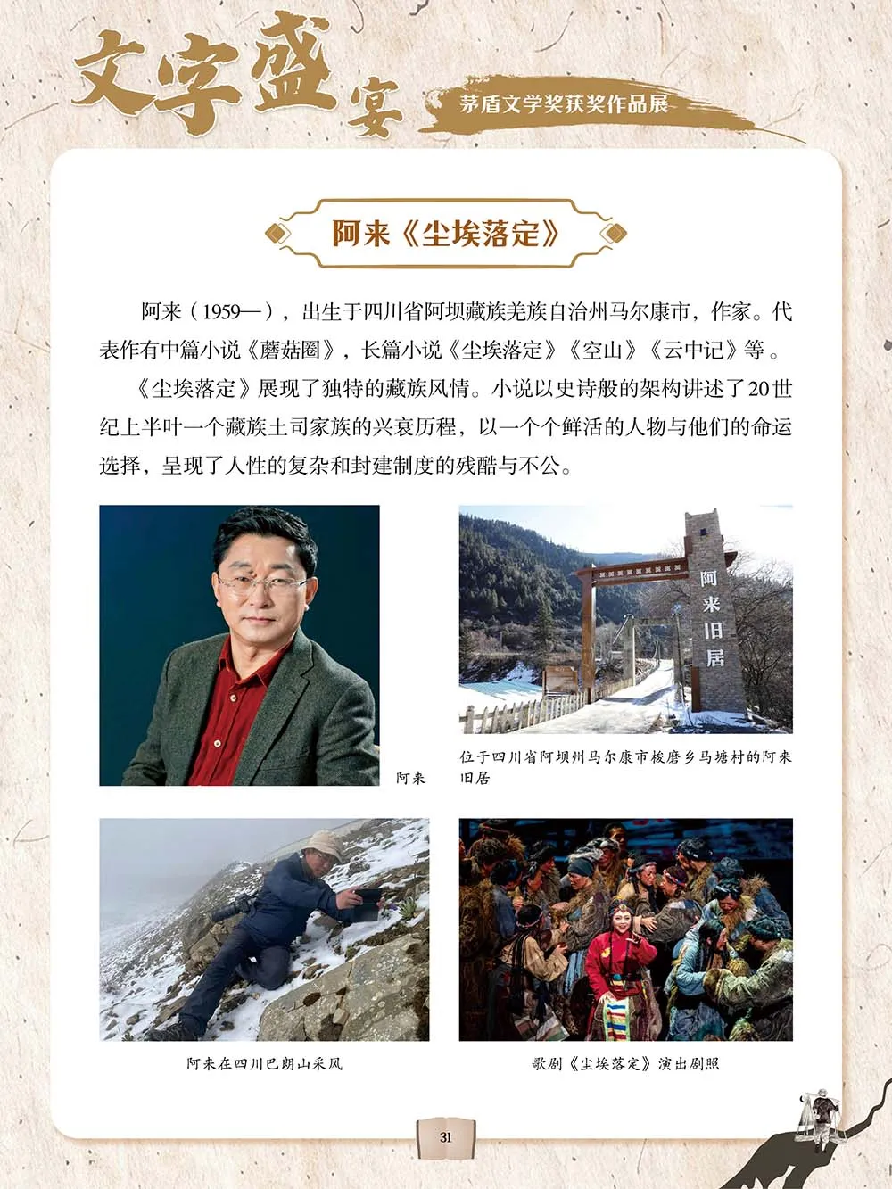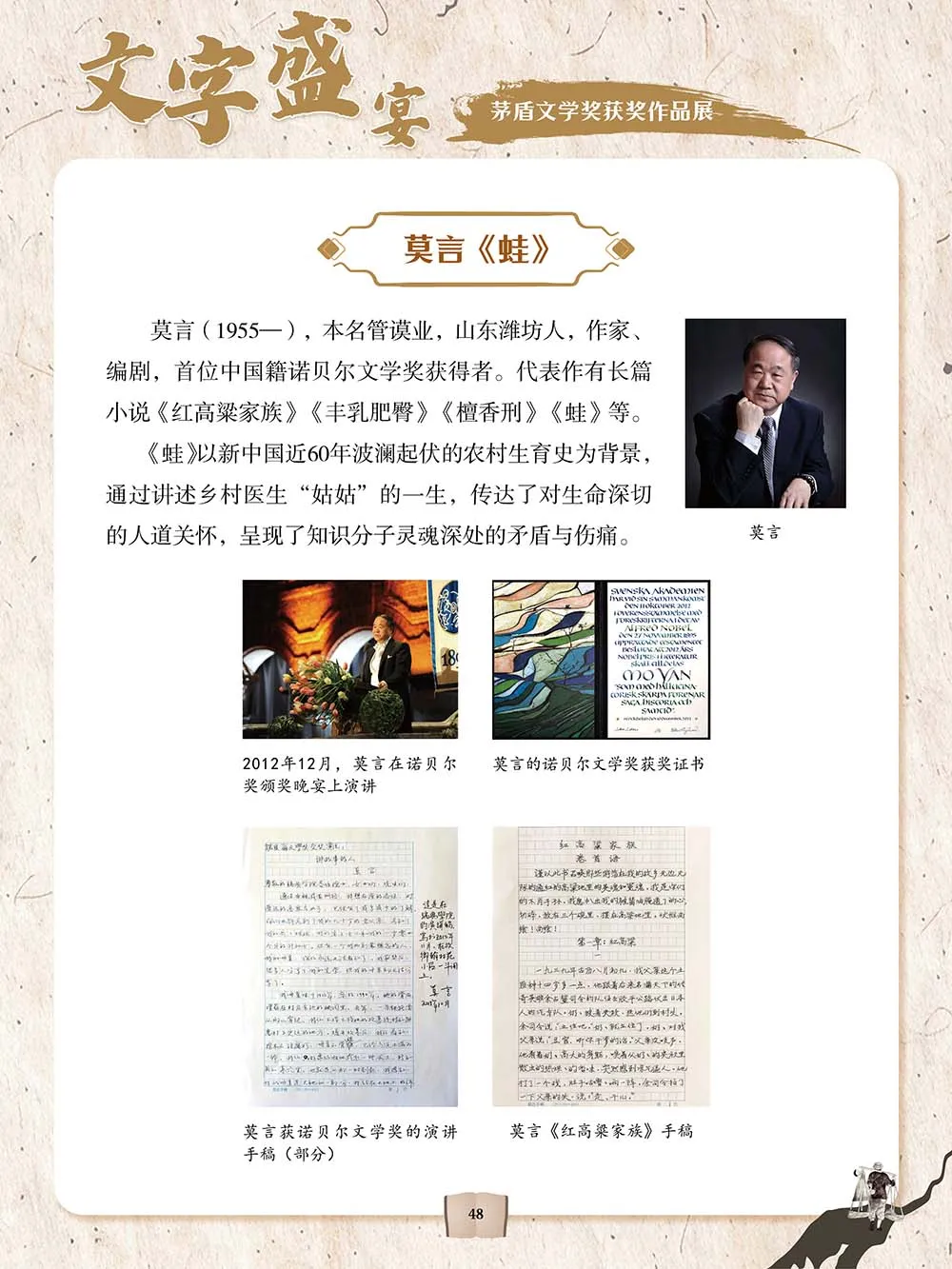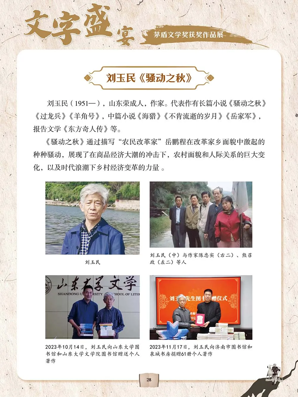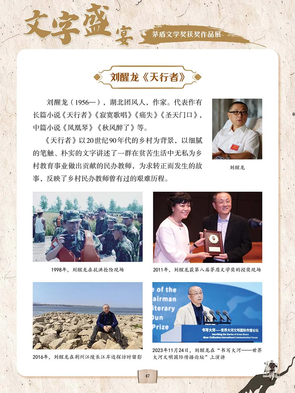 “文字盛宴——茅盾文学奖获奖作品展”介绍了茅盾文学奖的起源、评选流程,以及历届茅盾文学奖获奖作品,如霍达的《穆斯林的葬礼》、路遥的《平凡的世界》、刘醒龙的《天行者》、阿来的《尘埃落定》、梁晓声的《人世间》等,从小说的作者、内容等角度切入,带领读者品赏、领略这些获奖作品的丰厚内涵和艺术魅力。