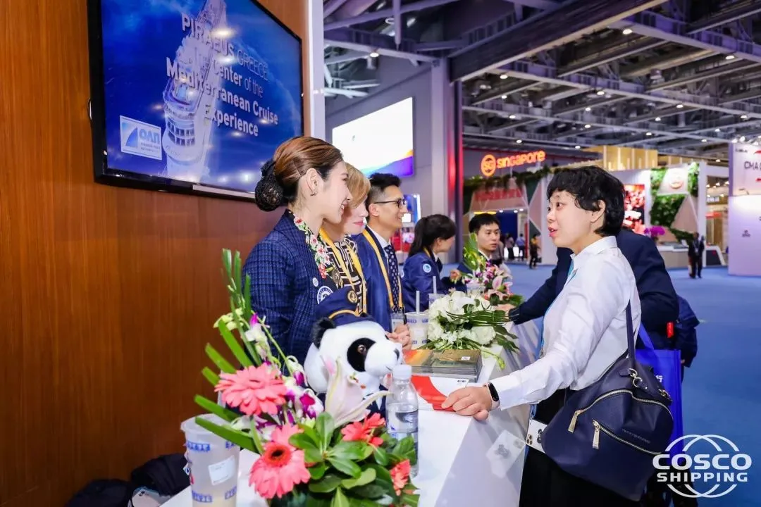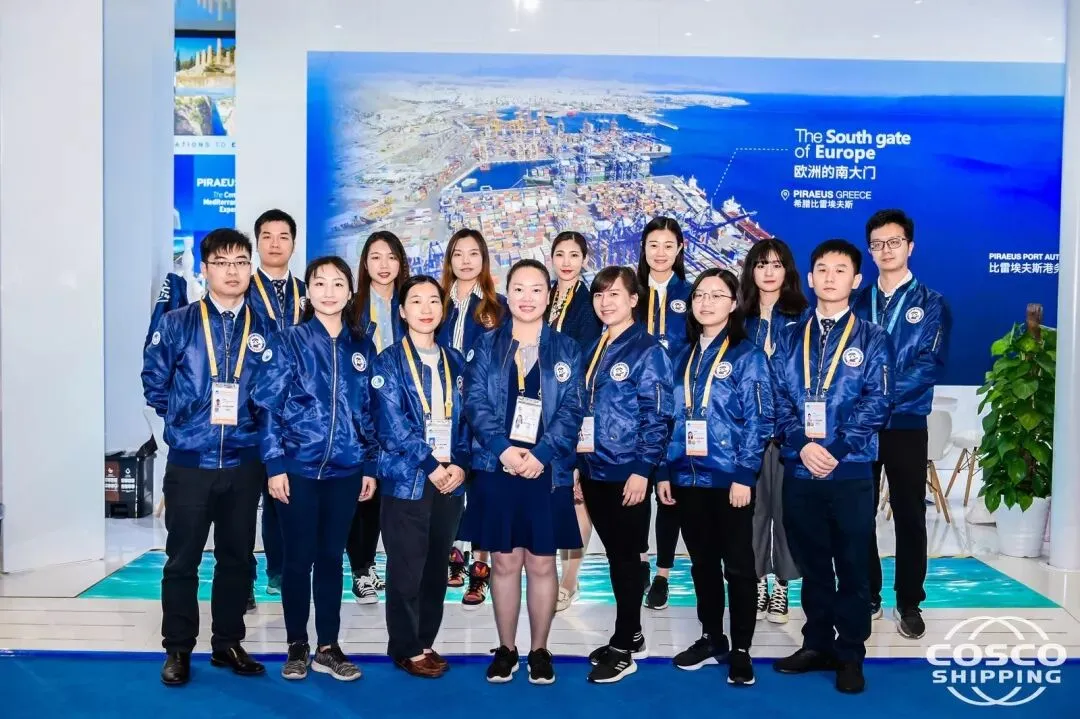 在比港展台前,多才多艺的志愿者们用一场快闪舞蹈展现出中远海运的蓝色魅力。