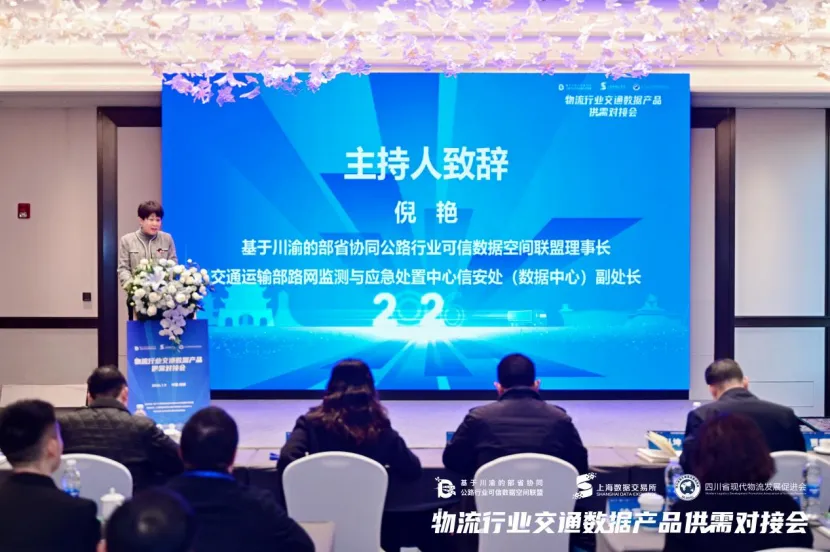 活动由交通运输部路网监测与应急处置中心信安处(数据中心)副处长倪艳主持,四川省交通运输厅科技与信息化处处长钟映梅、四川省交通运输厅交通产业处筹备组副组长范涛、四川省口岸与物流办公室副主任李从坤、成都市口岸与物流办公室产业发展处(供应链发展处)四级调研员贾乐林出席活动并做指导,重庆市交通运输委科学技术处处长王庆珍线上参与活动并致辞。