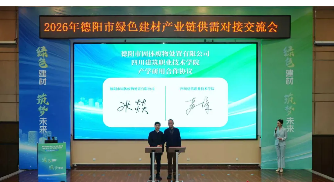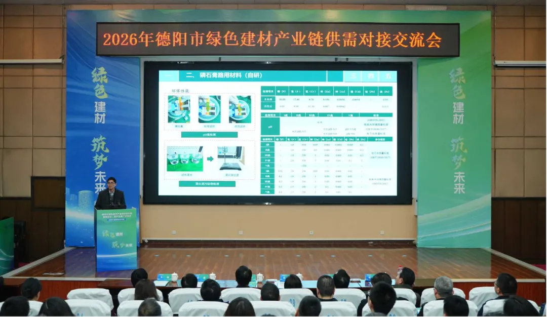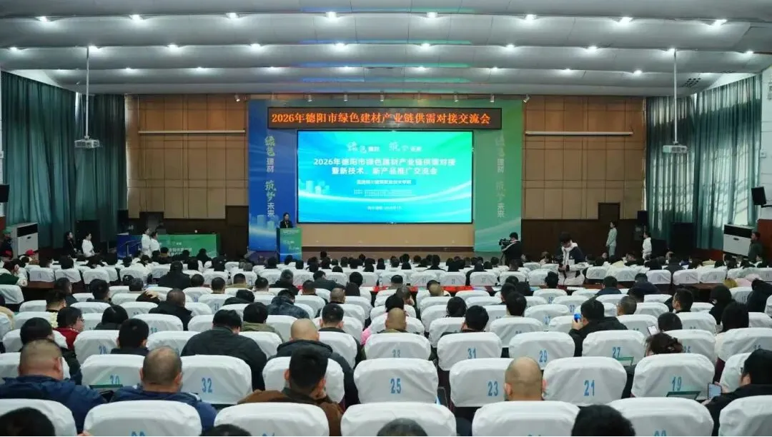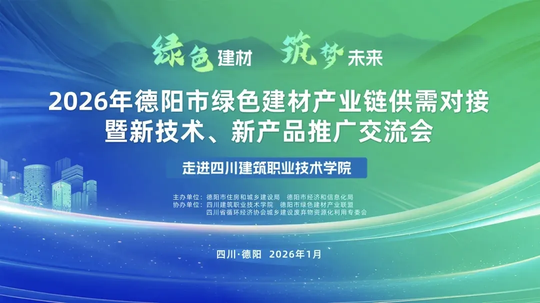 1月12日,2026年德阳市绿色建材产业链供需对接暨新技术、新产品推广交流会在四川建筑职业技术学院成功举办。本次会议由德阳市住建局、德阳市经信局主办,四川建筑职业技术学院、德阳市绿色建材产业联盟、四川省循环经济协会城乡建设废弃物资源化利用专委会协办,旨在搭建绿色建材供需对接平台,推动磷石膏、污泥等固体废弃物建材资源化利用,促进建筑行业绿色低碳转型。