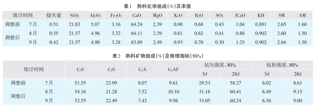 通过采取以上措施,自8月起熟料 3d、28d强度得到较大提高,熟料强度分别大于 30MPa、60MPa( 见表1、表2)。