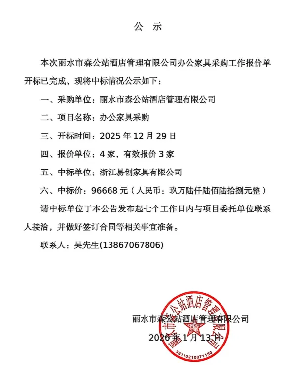 丽水市森公站酒店管理有限公司办公家具采购成交公告