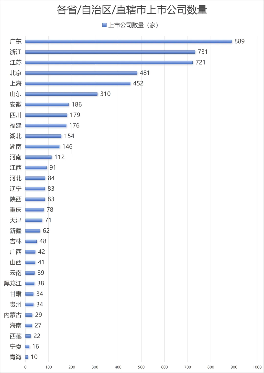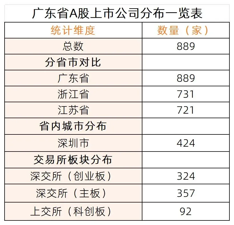 广东省以889家上市公司位居全国首位,占全国A股上市公司总量的16.26%,这一规模远超第二名浙江省的731家与第三名江苏省的721家。其中,深圳贡献424家上市公司,占全省近半数,这一数量甚至超过了全国绝大多数省份的上市公司总数,凸显出深圳作为粤港澳大湾区核心金融城市的资本集聚效应。