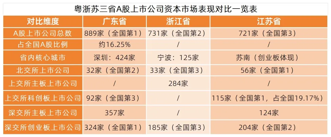 民营经济与科创实力决定资本市场活跃度。粤浙苏三省的领先地位,源于民营经济的活力与科创产业的深度融合。江苏省通过财政金融协同政策,围绕战略性新兴产业集群培育科创企业;浙江依托北交所推动专精特新中小企业资本化;广东凭借深交所板块优势激活民营创新创业活力。