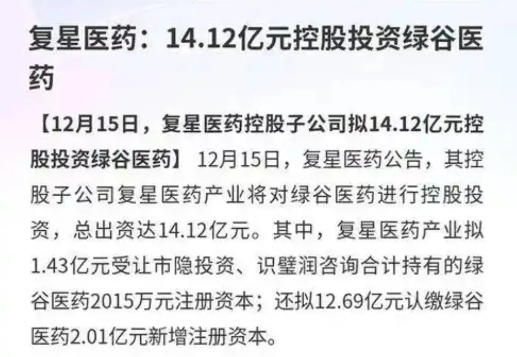 管理整合方面,复星医药将推动绿谷医药纳入集团统一的财务、内控与合规体系,实施标准化管理流程,确保财务数据真实透明,同时将绿谷医药纳入合并报表范围,定期披露经营情况与财务数据。