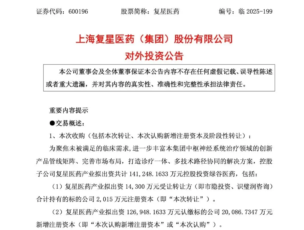 董事会审议通过后,复星医药于12月15日晚在上交所与港交所同步发布对外投资公告,详细披露了交易标的基本情况、交易方案、定价依据、资金来源、风险提示与中介机构意见等核心信息 。公告特别说明,本次收购旨在进一步丰富中枢神经系统治疗领域的创新产品管线矩阵,完善市场布局,打造诊疗一体、多技术路径协同的解决方案 。
