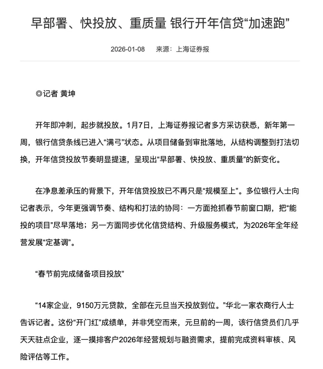2026年央行的会议明确提出,要保持资金充裕,引导银行均衡放贷,重点支持中小微企业。监管部门也要求银行把资金精准投向实体经济。因此,银行一开年就加快放贷,是在具体落实这些政策。
