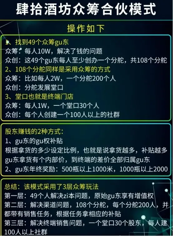 肆拾玖坊模式的核心创新在于其三级众筹体系,这一设计巧妙地将融资、渠道建设和用户绑定融为一体。