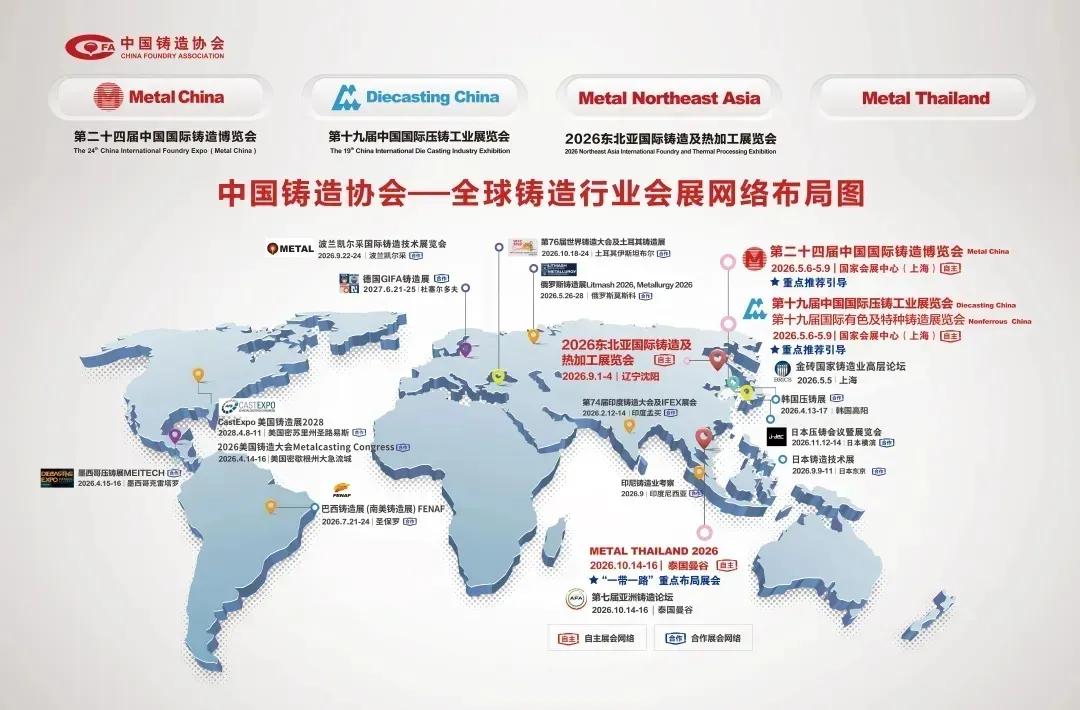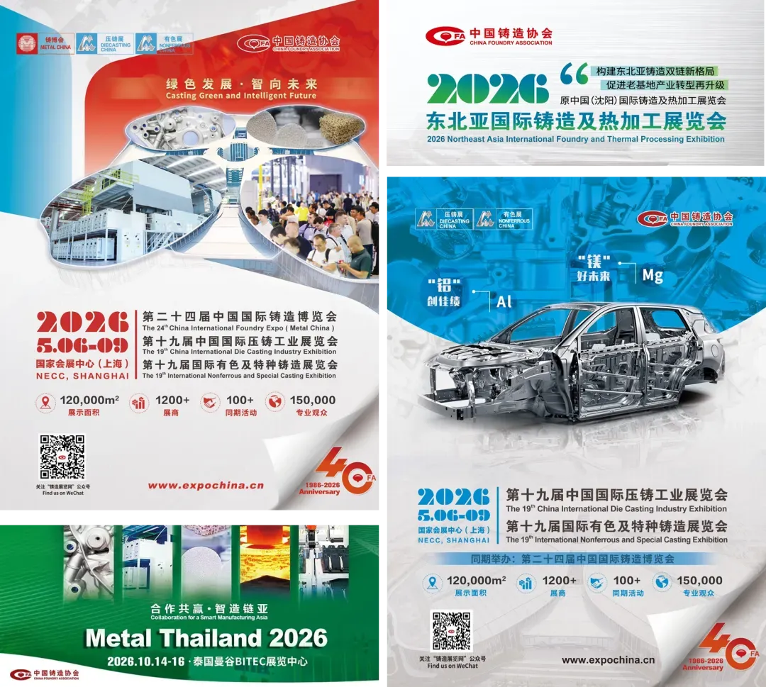 2026年,欣逢中国铸造协会成立40周年,中铸协将以更大格局开启新篇!第二十四届中国国际铸造博览会、第十九届中国国际压铸工业展览会&第十九届国际有色及特种铸造展览会、2026东北亚国际铸造及热加工展览会、METAL THAILAND 2026,将全面呼应【AI新场景、绿色会展、技术转化、数空间、会展出海、垂类展会】发展趋势,深耕海外会展新赛道、持续构建开放、协同、创新的会展新生态,全方位赋能铸造发展新未来。