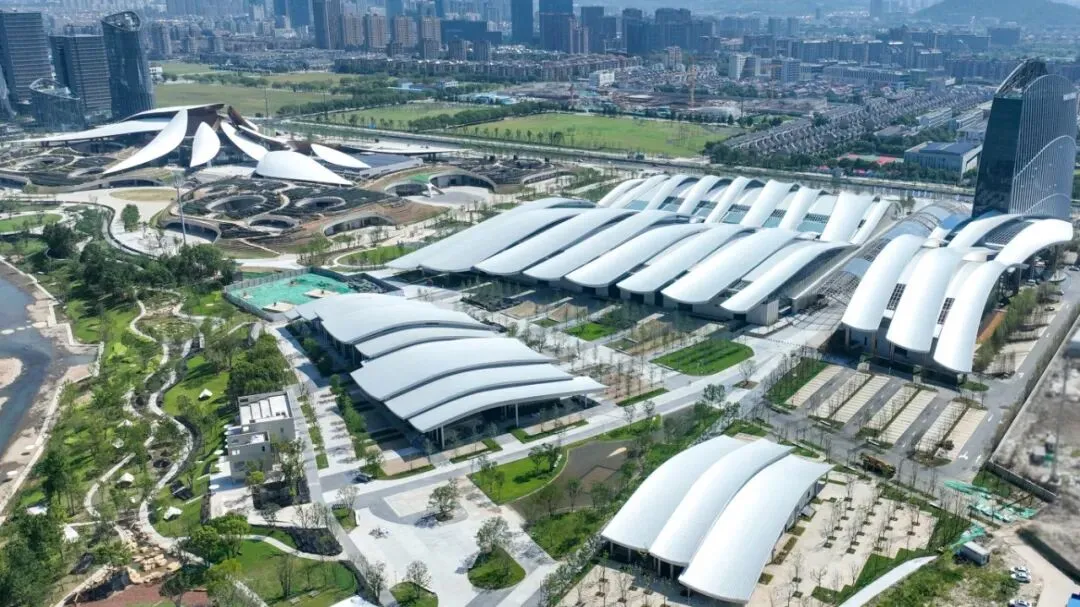 会展中心超90%景观建筑及小品均采用清水混凝土工艺,通过“精于工、细于质、美于形”的建造逻辑,实现结构即饰面的本体美学表达。其素雅灰调与镜面质感,既承载全生命周期低碳属性,又诠释了“少即是多”的现代景观哲学理念。