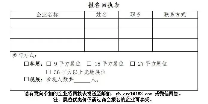 在3月20日前通过商会报名的企业,展位费统一给予一定优惠。标准展位9平方米(3×3)将从原价11800元优惠至8800元;光地展位从原价每平方米1180元优惠至900元。(展位分配遵循"先申请、先付款、先安排"的原则)