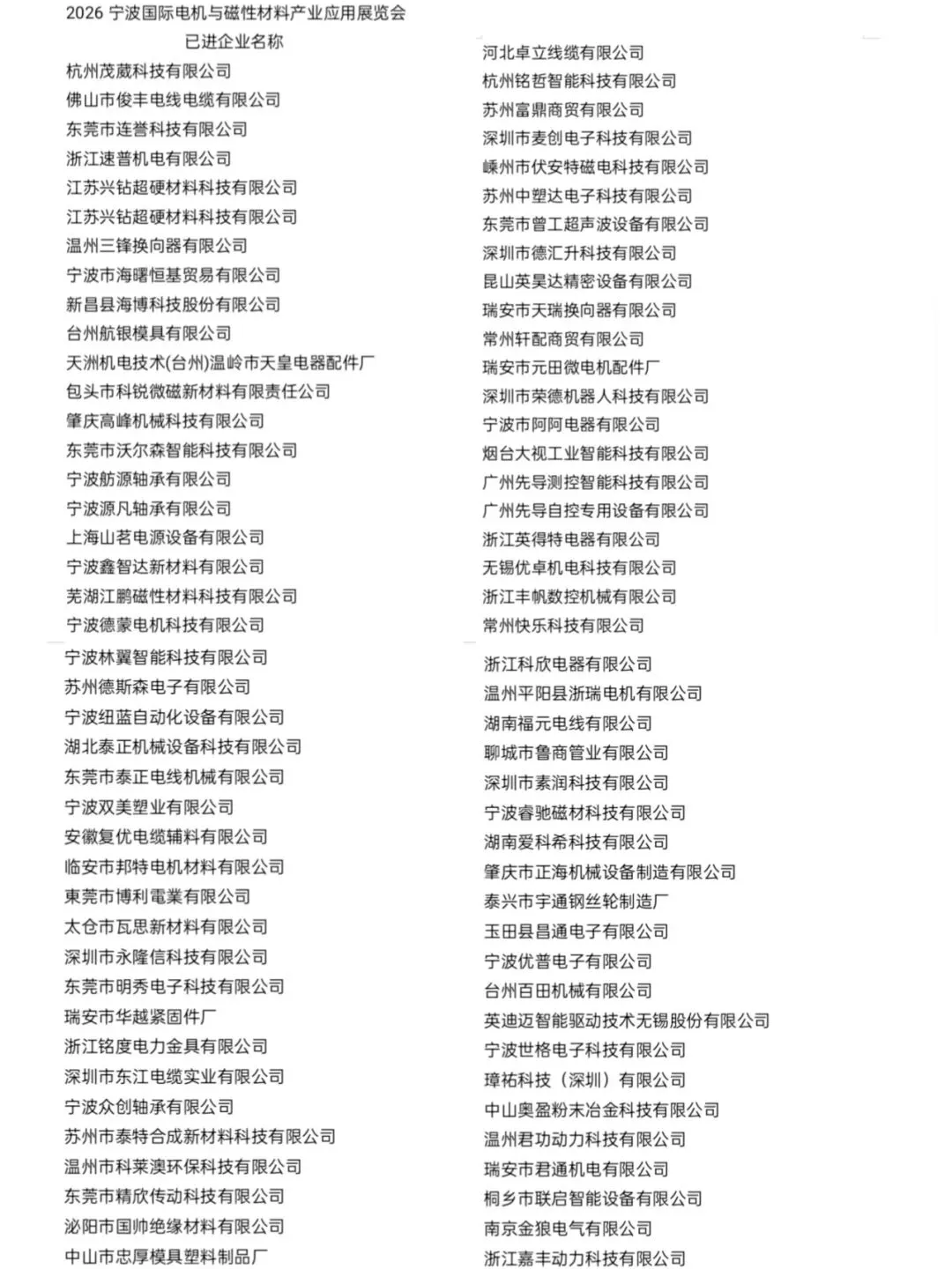 由浙江省电机行业协会指导、浙江省电气行业协会、宁波市磁性材料商会、宁波市电线电缆商会联合主办的“2026宁波国际电机与磁性材料产业应用展览会”将于2026年4月16日至18日在宁波国际会议展览中心5号馆举办,同期举办“2026宁波国际金属冶金暨线缆线束技术博览会”。