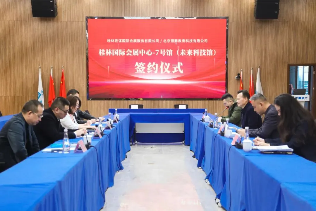 2026年1月12日,桂林新城投资开发集团有限公司下属子公司桂林宏谋国际会展服务有限公司(以下简称“桂林国际会展中心”)与北京银藤教育科技有限公司在桂林国际会展中心举行落地签约仪式,双方就桂林国际会展中心7号馆的改造升级与运营管理达成深度合作,共同打造以人工智能与科学教育为核心的“未来科技馆”。