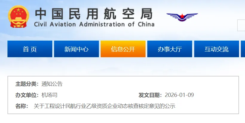 根据《关于开展工程设计民航行业乙级资质企业动态核查工作的通知》,民航局组织工作专班,依据相关法规和资质标准,对各企业自查证明材料进行研究核定,形成本次动态核查核定意见,现进行公示。公示时间为2026年1月9日至2026年1月15日。