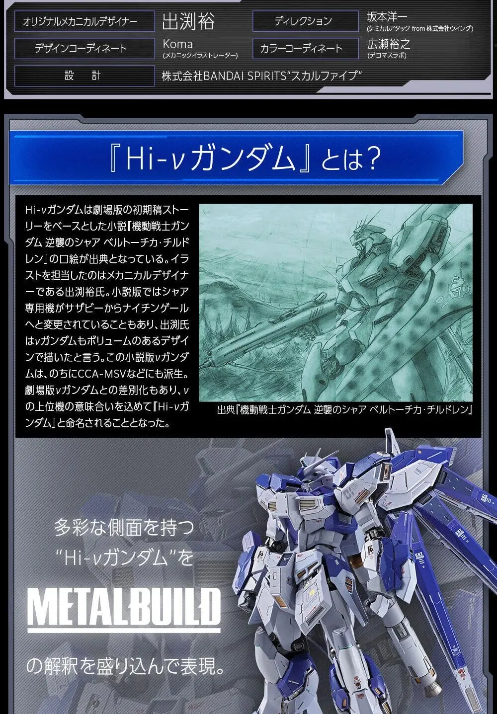本商品以2022年发售的量贩产品「Metal Build RX-93-ν2 Hi-ν高达」为基础,变更配色、附件装备等内容。将作为2026年3月27-7月6日在秋叶原「Tamashii Nations Store」召开的「Metal Build EXPO」纪念活动商品进行贩卖!