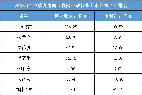 根据东财行业分类,2025年1-3季度中国互联网金融行业上市公司企业排名如下:(A股上市公司)
