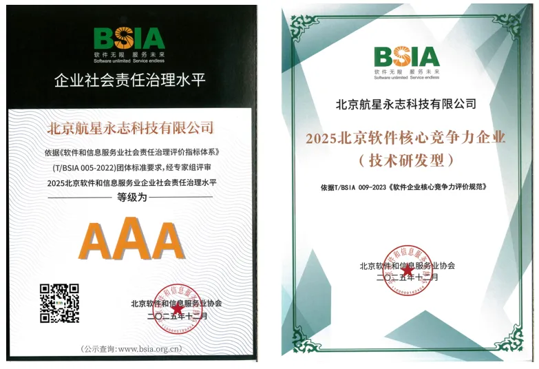 近日,北京软件和信息服务业协会第十一届会员代表大会第三次会议暨2025企业服务年会在北京成功召开,会上发布了《2025北京软件和信息服务业企业社会责任治理水平评价结果》。航星永志凭借在社会责任治理方面的突出实践,以及技术研发与软件服务的综合实力,同时获评“2025北京软件和信息服务业企业社会责任治理水平AAA级”与“2025北京软件核心竞争力企业(技术研发型)”两项殊荣,标志着航星永志的技术实力与社会责任实践得到业界高度认可。
