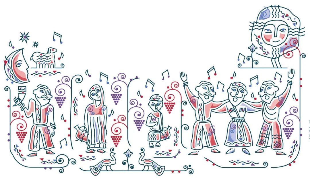 有故事感的设计同样不可或缺。格鲁吉亚传唱着众多以“葡萄酒”为主题的民乐歌谣。RANINA拉尼娜就源于格鲁吉亚一首家喻户晓的民谣“心中的女神”,酒标设计灵感来源于每年的9月丰收季,每当丰收之时大家都非常的兴奋和快乐,采用图腾风格加鲜艳的色彩感。古老文明与现代的碰撞通过视觉效果给消费者呈现饮用拉尼娜微醺后的畅意体验。
