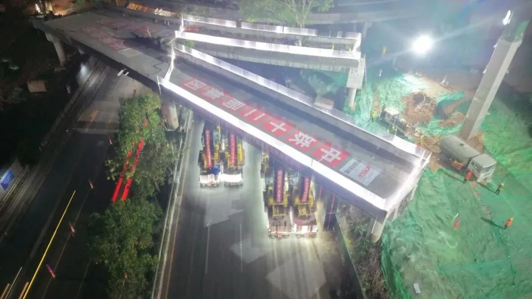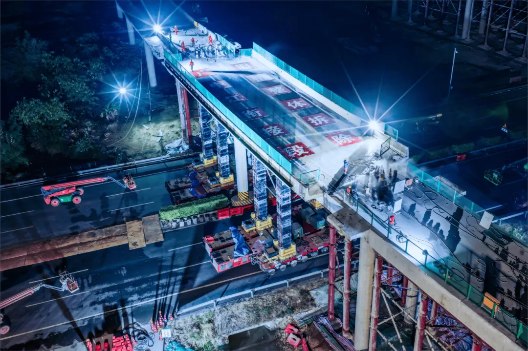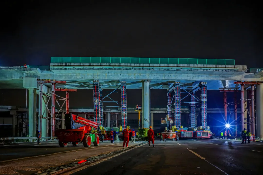 施工过程中,顶升设备将桥梁平稳托起,通过模块车整体平移运出高速主线外,实现梁体“平移式”安全转运。