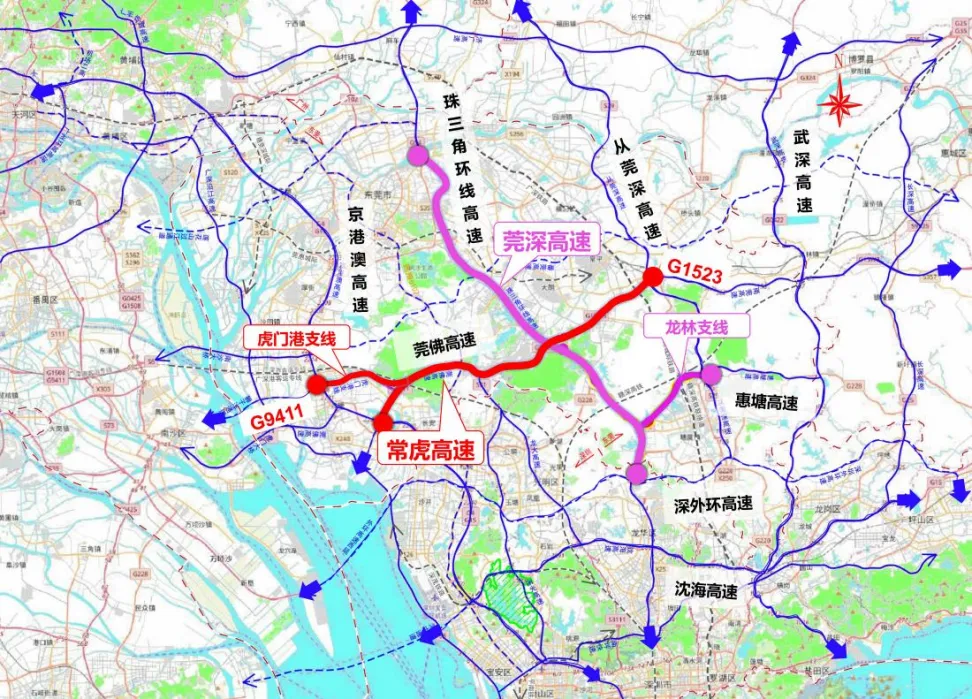 常虎高速改扩建工程全长约50.6公里,设计速度120公里/小时,是粤港澳大湾区狮子洋过江通道的重要连接线,串联起东莞、惠州与广州南沙,并与西侧广中江高速、东侧甬莞(惠常)高速一起,构筑横贯南沙、辐射粤东西两翼地区的高速公路网络。