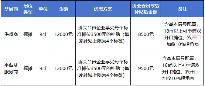天津市跨境电子商务协会针对企业参加“第六届中国跨境电商交易会”推出展位补贴政策,助力企业拓展市场、提升品牌影响力。具体收费标准+优惠方案如下(定展期间入会均可享受会员补贴政策):
