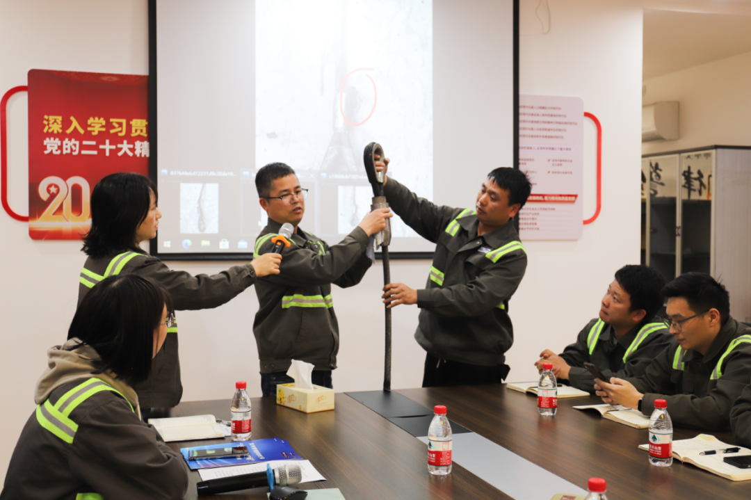 会上,新弈创新工作室对《门机钢丝绳防磨损保护装置》做了详细的介绍和演示,此项于2022年10月取得的国家实用新型专利,发内容包括连接套,连接套的一端固定连接有锥形防护套,防止挂仓时钢丝绳直接与外物接触摩擦磨损,提高了钢丝绳的使用寿命且极大程度增强安全性能。门机作为港区重要的大型机械,也是温州港各大港区普遍适用的机械设备,各家港区纷纷表示了对于此项技术的需求。