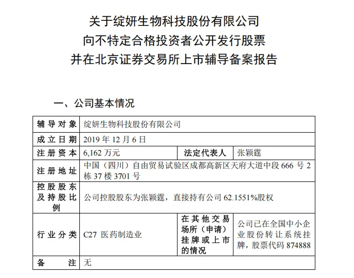 继去年9月成功挂牌新三板后,绽妍生物又开启了北交所IPO的新进程。据中国证监会官网显示,昨日(1月13日),绽妍生物科技股份有限公司(下称绽妍生物)已在四川证监局完成IPO辅导备案登记,辅导机构为中国国际金融股份有限公司(下称中金公司)。新三板挂牌仅4个月,绽妍生物便冲击北交所IPO,其底气究竟从何而来?据证监会发布的《关于绽妍生物科技股份有限公司向不特定合格投资者公开发行股票并在北京证券交易所上市辅导备案报告》(下称《备案报告》)披露,1月12日,绽妍生物已与中金公司正式签署辅导协议,迈出了北交所上市之路的关键一步。▍截自中国证监会官网