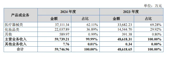 具体来看,绽妍生物主营业务分为医疗器械类(医用敷料产品)和化妆品类两大板块。2023年至2024年,医疗器械类产品收入分别为3.37亿元、3.71亿元,占总营收的69.28%、62.11%;化妆品类产品收入则为1.45亿元、2.2亿元,占比达29.92%、36.89%。▍截自绽妍生物公开转让说明书
