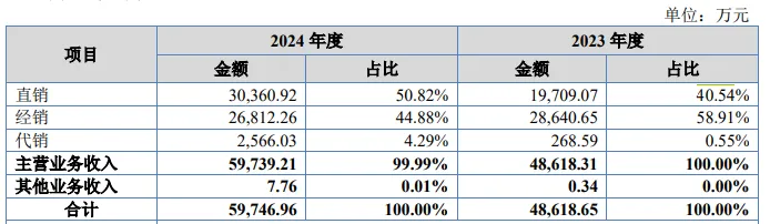 绽妍生物在公开转让说明书中提到,若按照2023年销售额排名,其在中国皮肤屏障修护医用敷料市场主要竞争者中排名第三。渠道方面,绽妍生物构建了“直销+经销+代销”三位一体的销售体系。其中,2023年及2024年,该公司经销渠道收入分别为2.86亿元、2.68亿元,占比58.91%、44.88%,经销商总数由595家缩减至526家。直营板块则以电商平台为主,2023年及2024年分别实现营收1.97亿元、3.04亿元,占比从40.54%提升至50.82%。▍截自绽妍生物公开转让说明书