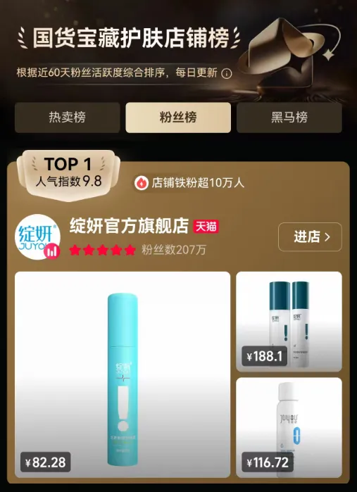 绽妍生物公开表示,公司来自线上直销渠道的收入增长较快,主要系公司大力在天猫、抖音等电商平台开设自营旗舰店,并积极引导销售和推广资源向线上直销渠道倾斜,因此,该公司在2024年通过各类电商平台实现的销售金额大幅增长。据了解,绽妍生物正积极引导销售和推广资源向线上渠道倾斜,大力培育线上直销业务,除巩固传统天猫平台业务优势外,还加大抖音、快手等平台直销业务投入。在2023年618、双11等大促节点,公司旗下绽妍品牌均位列医用敷料品牌榜销售额第三。此外,从皮肤学级护肤品来看,截至2024年,绽妍生物旗下相关产品入驻1400余家院线渠道、15000余家专业药房和5100余家化妆品连锁门店等专业渠道。截至目前,绽妍生物暂未披露2025年上半年和全年的业绩。不过,据青眼情报数据显示,2025年,绽妍品牌在抖音平台的GMV已超过1.2亿元,销量为100万+件。而淘天平台方面,绽妍在天猫平台的销售情况也可圈可点。据悉,绽妍官方旗舰店是天猫“国货宝藏护肤店铺榜”粉丝榜TOP1,该店铺共有粉丝数207万,其中店铺铁粉超10万人。据了解,该店铺年销量为200万+,近一个月热销达10万+件。其中,绽妍紧致焕采双抗面膜已售9万+件。与此同时,绽妍皮肤修护敷料(蓝膜)的销量也超过了8万件。此外,绽妍B5面膜、医用无菌敷贴等产品的销量均超过了5万件。▍截自绽妍天猫旗舰店
