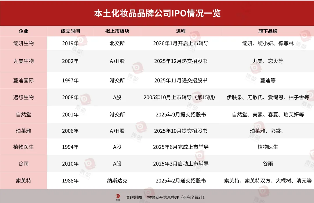 公开转让说明书还披露,随着业务规模扩张,绽妍生物已在陕西西安、湖南湘潭建立了自主生产的工厂产线,自主生产比例逐步提升。这也说明,绽妍生物正在进一步提升企业的供应链能力。随着绽妍生物启动北交所IPO辅导,国货美妆上市赛道也愈发火热了。据青眼不完全统计,目前共有9家化妆品品牌企业正处在IPO阶段。而上月30日,林清轩已在港交所敲钟上市。具体来看,在上述9家化妆品企业中,索芙特是唯一一家拟在美国纳斯达克上市的企业,该公司已于去年2月提交了招股书。此外,珀莱雅、自然堂、丸美生物、蔓迪国际则均是赴港股上市,这4家企业均已提交了招股书。值得一提的是,珀莱雅和丸美生物均是为了冲击A+H股。此外,谷雨、植物医生、远想生物等则处于上市辅导阶段,其中植物医生已在去年6月完成上市辅导。除上述化妆品企业外,目前在工厂原料端,如天赐材料、维琪科技、格林生物、万香科技;在包材端,如江天科技、金桥德克;在渠道端,如凯洁电商、若羽臣等超20家化妆品相关企业也正在冲击IPO的进程中。其中,天赐科技、若羽臣的目标也都是冲击A+H 股。某种程度上说,在行业竞争加剧的当下,美妆企业希望通过IPO并借助资本的力量实现突围,无疑是一种必然选择。参照珀莱雅、上美股份等公司上市后的发展速度,即可见一斑。据了解,珀莱雅在上市后,公司营收从上市前2017年的不到20亿元,一路增长至2024年超100亿元;上美股份也是由上市前的不到30亿元的营收,已增长至2024年的近70亿元。与此同时,也可以看到的是,近几年来,上榜天猫双11美妆TOP10的品牌也均为国内外的上市公司旗下品牌。究其原因,也在于美妆行业的竞争早已从此前单一的流量竞争、营销竞争,转变为研发力、产品力、营销力、市场洞察等全方位的综合实力的较量。然而,成功IPO并非易事。部分企业就在冲击IPO的进程中,因为各种原因而铩羽而归。典型如,日前,创尔生物即发布《关于终止上市辅导备案的提示性公告》,终止上市辅导。据了解,其或是今年首个终止上市的胶原蛋白赛道企业(详见青眼文章《“胶原贴敷料第一股”终止上市!》)。毫无疑问,资本的注入将加速行业洗牌,具备核心技术、品牌壁垒、供应链优势的企业有望脱颖而出,而缺乏核心竞争力的企业则可能在资本化进程中被淘汰。因此,从长远来看,美妆上市浪潮不仅会重塑美妆行业的竞争格局,也将推动整个产业向更成熟、更健康的方向发展。