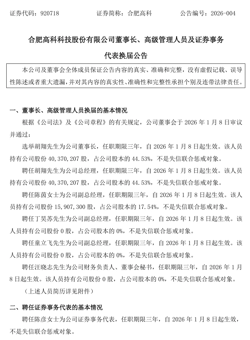 近日,合肥高科科技股份有限公司(下文简称“合肥高科”,920718.BJ)发布公告,公司选举胡翔为公司董事长,聘任胡翔为公司总经理,聘任陈茵、丁昊苏、童立飞为公司副总经理,聘任汪晓志为公司财务负责人、董事会秘书,聘任陈彦为公司证券事务代表,任职期限均为三年,自2026年1月8日起生效。