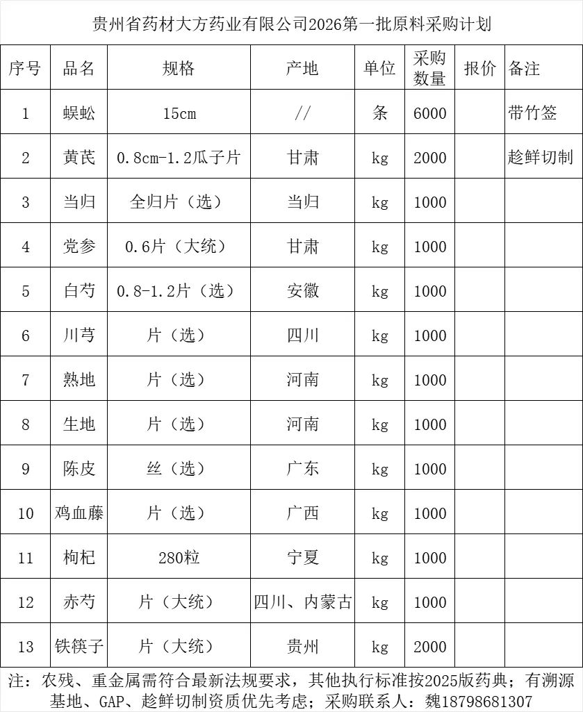 贵州省药材大方药业有限公司采购招标13个品种 免费查看联系方式 药材计划2026.1.14