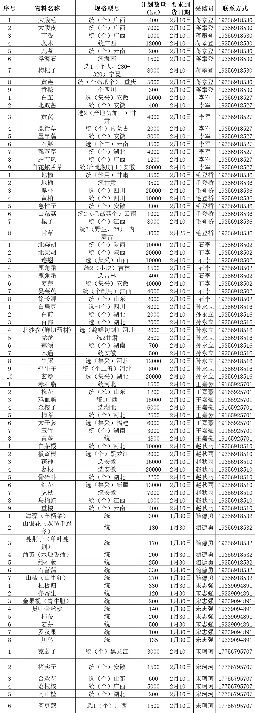 安徽普仁中药饮片有限公司计划采购77个品种:大腹毛、大腹皮、丁香、莪术、儿茶、浮海石、枸杞子、黄连、香橼、白芷、北败酱、黄芪、鹿衔草、墨旱莲、石斛、豨莶草、肿节风、白花蛇舌草、地榆、厚朴、黄柏、急性子、山慈菇、栀子、甘草、北柴胡、连翘、鹿角霜、麦芽、吴茱萸、徐长卿、白扁豆、白前、百部、北沙参(鲜切药材)、党参、莲须、木通、牛膝、牵牛子、玄参、赤石脂、槐花、鸡血藤、金樱子、柿蒂、太子参、玉竹、黄芩、白茅根、板蓝根、茯神、葛根、骨碎补、红花、虎杖、乌梢蛇、重楼、海藻(羊栖菜)、山银花(灰毡毛忍冬)、蔓荆子(单叶蔓荆)、蒲黄(水烛香蒲)、络石藤、石菖蒲、山楂(山里红)、杠板归、槲寄生、金果榄(青牛胆)、贯叶金丝桃、罗汉果、川乌、茺蔚子、楮实子、合欢花、荔枝核、南山楂、肉豆蔻