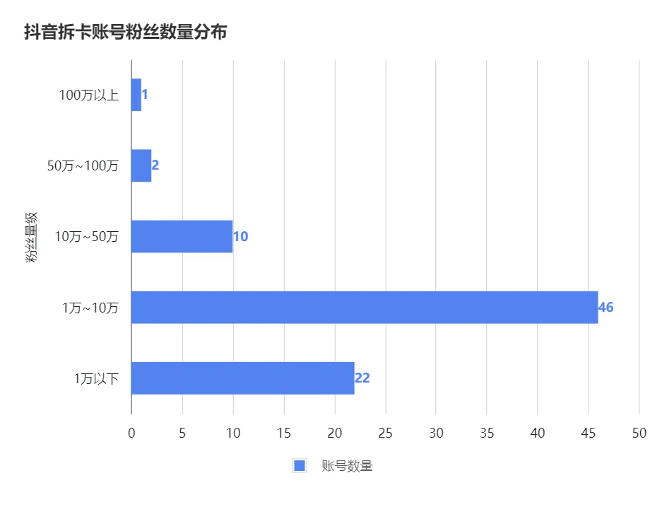 这个新风口甚至能惠及小博主。据蝉魔方数据,2024年上半年“潮玩盲盒”类目抖音号TOP200中,抖音ID带“拆卡”的账号共81个,其中有22个账号的粉丝量不足1万,46个账号粉丝量在1万至10万之间。