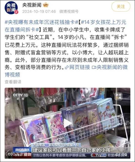 此外,拆卡直播也在对未成人产生负面影响。“叠叠乐”和“以小博大”等玩法本身带有强烈的诱导与赌博色彩,成年人容易沉迷,未成年人更难抵抗诱惑。