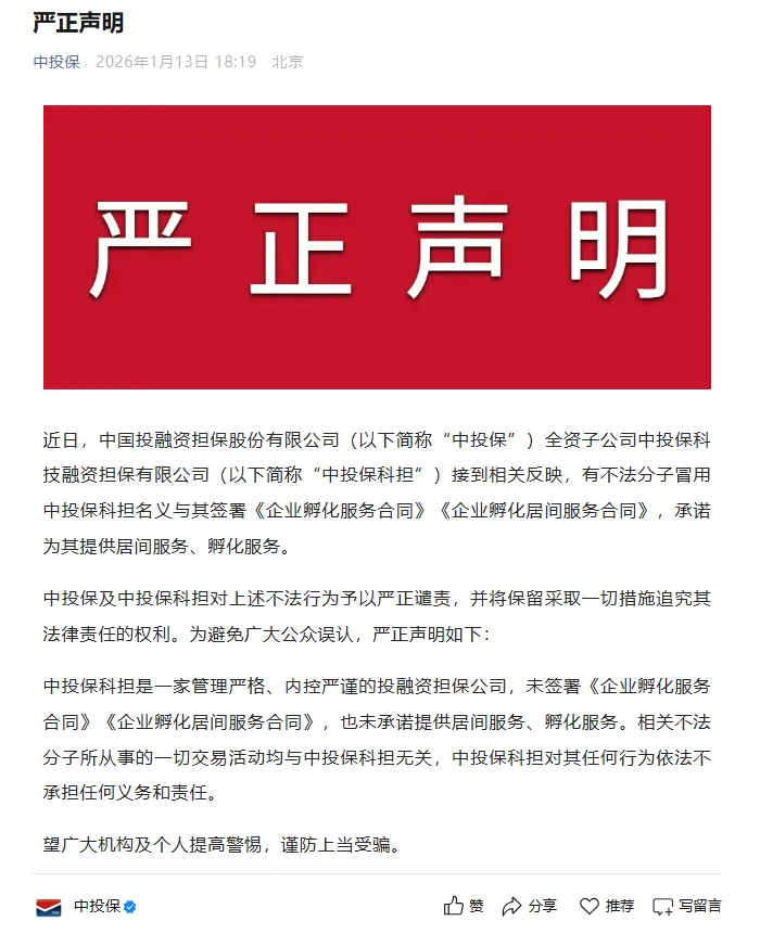 昨天晚间,中国投融资担保股份有限公司(以下简称“中投保”)全资子公司中投保科技融资担保有限公司(以下简称“中投保科担”)在其微信公众号发布《严正声明》,称: