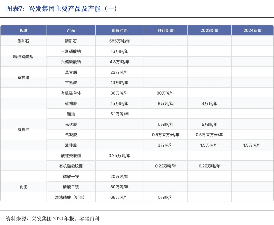 兴发集团长期专注于精细化工产品开发,是全国精细磷产品门类最全、品种最多的企业之一。目前公司已有磷矿石、黄磷、磷酸、工业级和食品级三聚磷酸钠、磷铵、草甘膦、有机硅、烧碱等百余种产品,产业链覆盖磷化工、有机硅、精细化工,形成了磷硅盐协同、矿肥化结合和电子化学品突破的产业优势。包括100万吨磷铵、585万吨磷矿、23 万吨草甘膦、116万吨有机硅单体等。