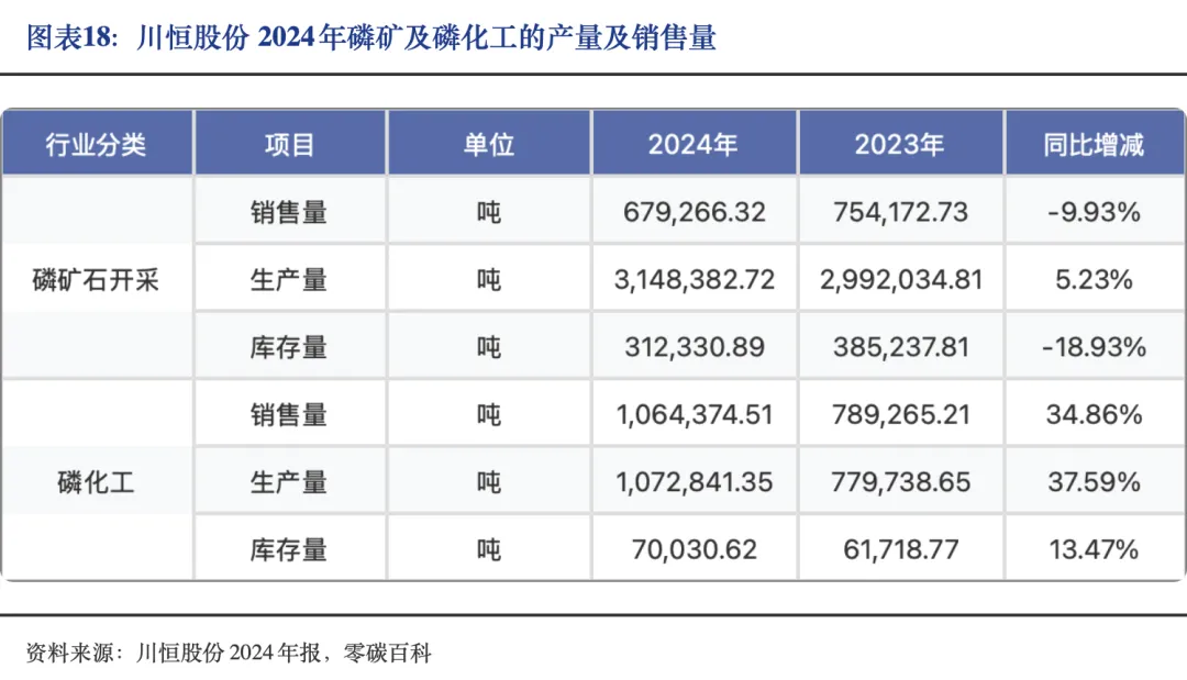 2024年川恒股份磷矿石产量达314.84万吨,同比+5.23%,磷化工产品总产量为107.28万吨,同比+37.59%。