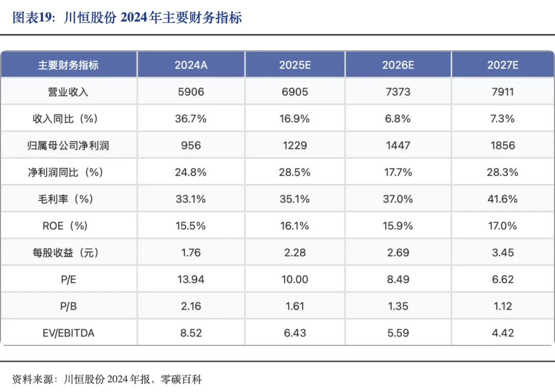 主营产品价格上行叠加新增产能释放双驱动,全年业绩实现显著增长。2024年,川恒实现营业收入59.06亿元,同比+36.72%;实现归母净利润9.56亿元,同比+24.80%。其中,公司主营产品饲料级磷酸二氢钙、磷酸一铵、磷酸、磷矿石分别实现营收14.45、11.76、18.72、5.43亿元,同比+20.16%、+26.21%、+120.63%、 -4.35%。
