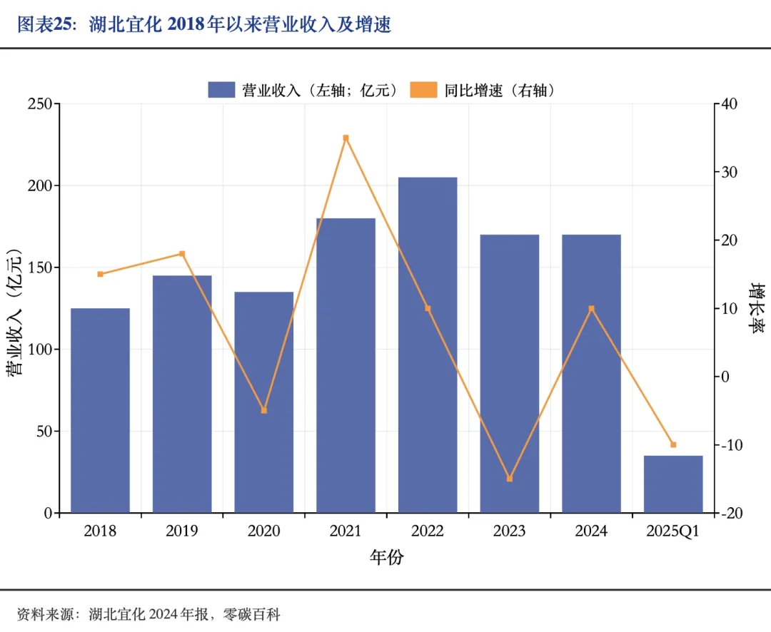 湖北宜化通过一体化经营模式构建了从磷矿资源到磷酸二铵产品的完整产业链。目前,湖北宜化拥有3亿余吨磷矿资源,自有磷矿产能330万吨,规划产能290万吨;参股的江家墩矿业所拥有的1.3亿吨磷矿储量和180万吨产能的稳定供应,有效支撑磷酸二铵产能需求。在磷矿石价格高位支撑、行业供需结构稳定的背景下,2024年磷酸二铵实际产量达139万吨,销量达138万吨。