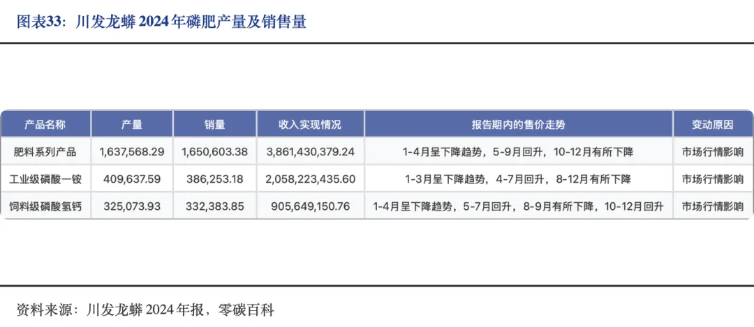 川发龙蟒作为工业级磷酸一铵全球领先的生产企业,其2024年产量为40.96万吨,同比增长18.98%;饲料级磷酸氢钙产量为32.51万吨,同比下降7.98%;肥料级磷酸一铵、复合肥等产品产量合计163.76万吨,同比增长22.95%。