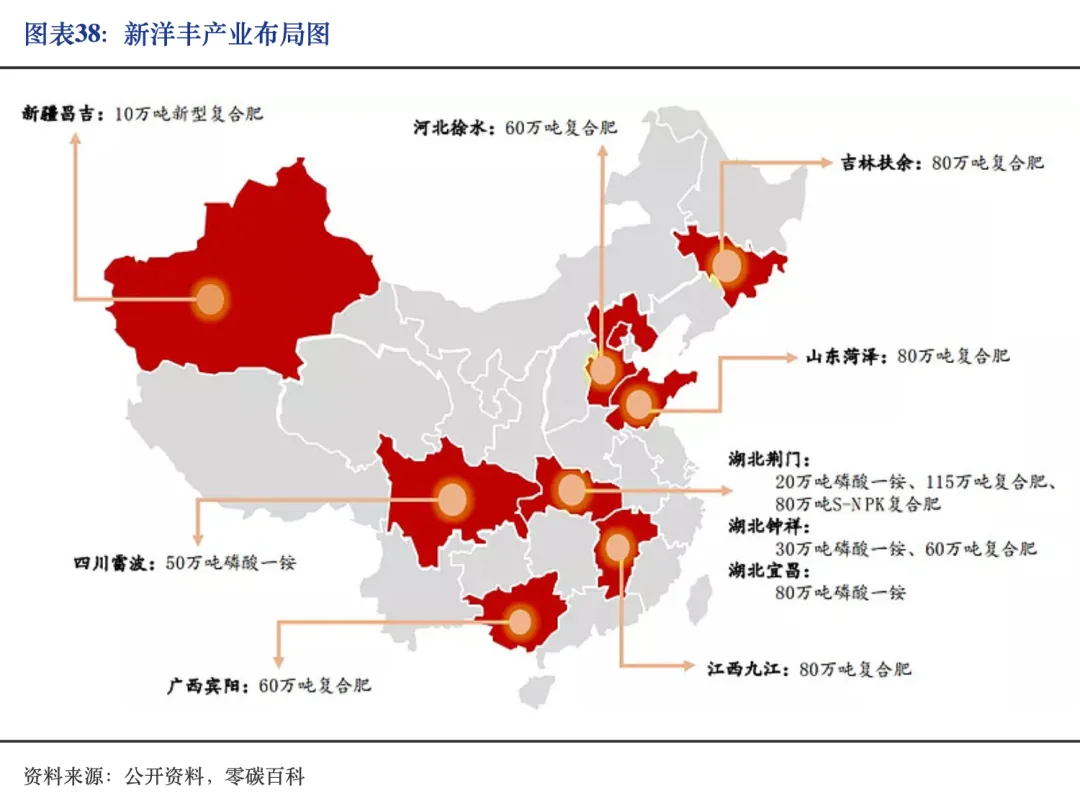 新洋丰拥有复合肥设计产能798万吨/年,另有85万吨在建;有农业级磷酸一铵设计产能170万吨/年和工业级磷酸一铵设计产15万吨/年;此外,新洋丰已建成30万吨/年渣酸肥和15万吨/年水溶肥产能。新洋丰肥料产区如下图所示: