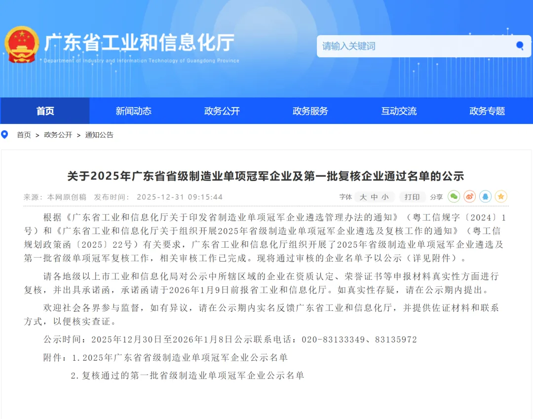 广东省制造业单项冠军企业的遴选,是省坚持“制造业当家”、打造国际竞争力企业集群的重要举措,入选企业需长期专注特定细分领域,产品市场占有率位居全国前3位或全球前5位,且在持续创新能力、质量效益等多维度达到高标准。