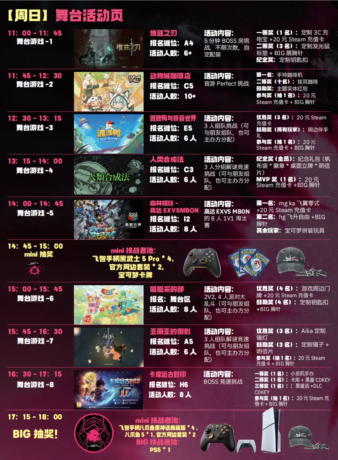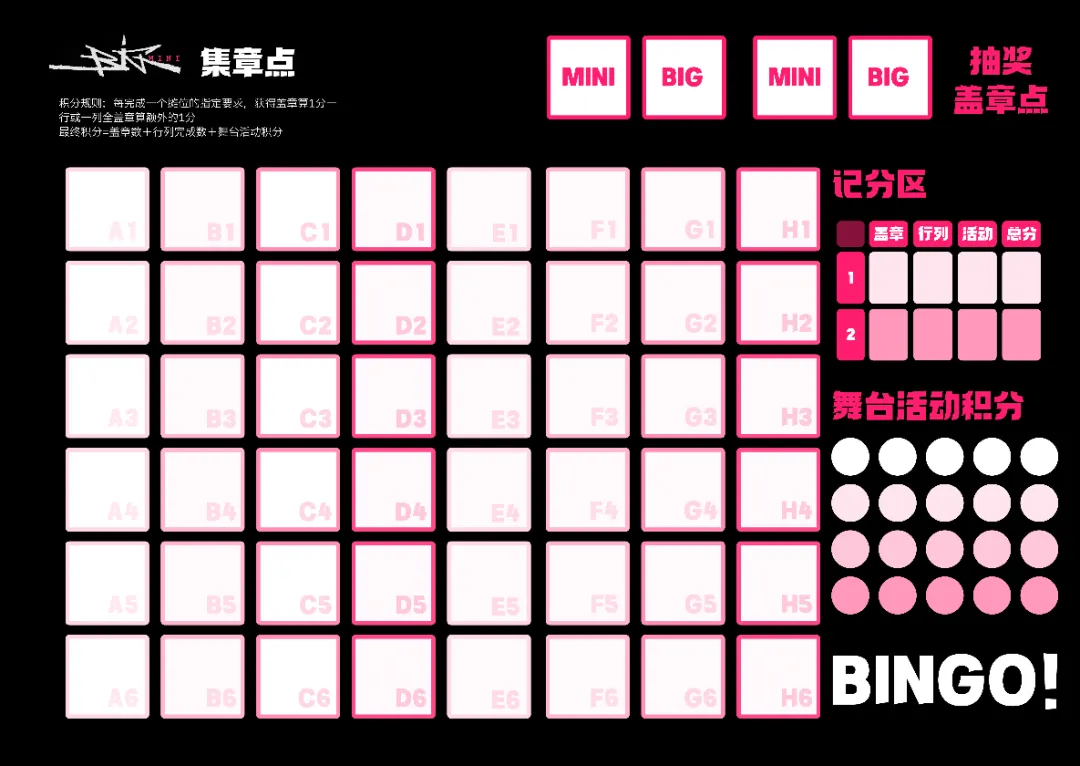 BIG展将所有参展游戏按照地图分布方式制作成了一张6X8的BINGO集章表。每个摊位游戏都有专属挑战任务以及专属印章,完成一个摊位的任务即可获得摊位盖章(1积分),集齐一整行/一整列的盖章会获得额外的1积分。