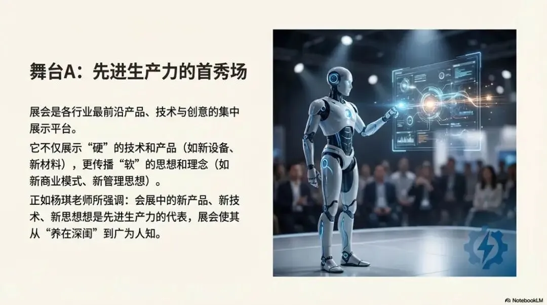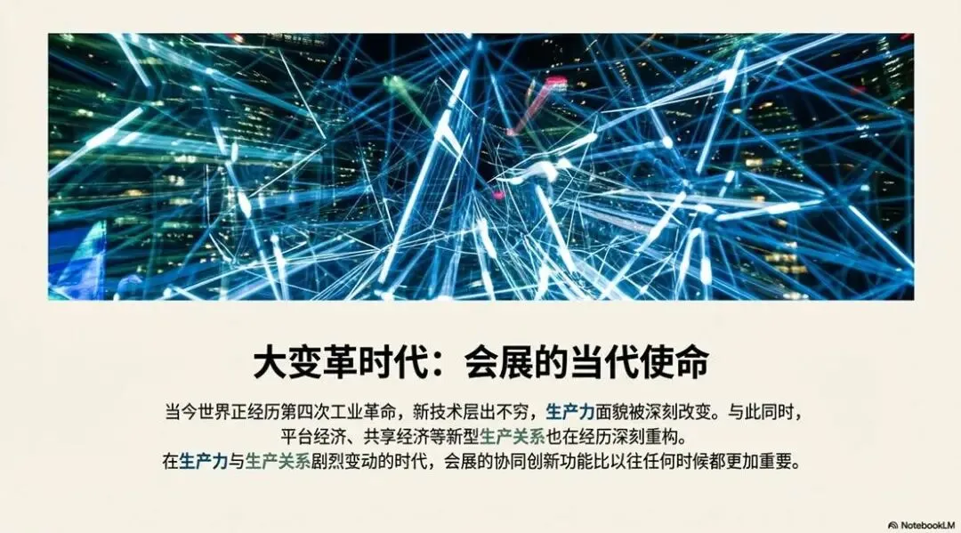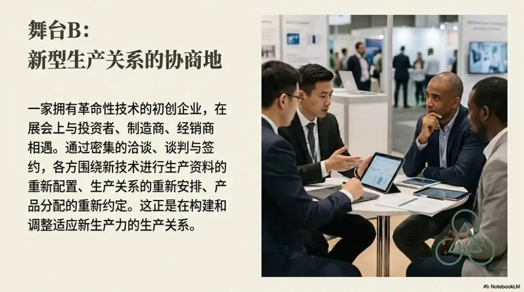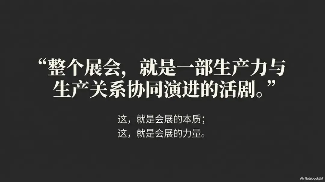 这样,技术进步带来的社会调整就能以更加平和、有序的方式进行。杨琪老师是研究哲学的,他用马克思主义的哲学思想解释会展活动的这一洞察,对于我们理解当代会展业的发展具有重要的指导意义。当今世界,正经历着第四次工业革命的洗礼。人工智能、大数据、物联网、区块链等新技术层出不穷,深刻改变着生产力的面貌。与此同时,新的商业模式、新的组织形式、新的分配机制也在不断涌现,生产关系正在经历深刻重构。在这样的大变革时代,会展的协同创新功能显得尤为重要。一方面,会展帮助新技术更快地找到应用场景和合作伙伴。一个人工智能企业参加行业展会,可能在几天之内接触到数百个潜在客户,这比传统的市场开拓方式高效得多。另一方面,会展帮助社会各方更平稳地适应技术变革。当传统行业的从业者在展会上看到新技术的发展趋势,他们就能更早地开始转型准备;当政策制定者通过展会了解行业动态,他们就能制定更有前瞻性的政策。更深层次地说,会展正在成为构建新型生产关系的重要场域。平台经济、共享经济、生态型企业等新型组织形式,往往首先在会展中得到展示和讨论;跨界合作、开放创新、价值共创等新型合作理念,也往往通过会展传播开来。可以说,当代会展不仅是商品和技术的展示场,更是新型生产关系的孵化器。回到文章开头的问题:为什么会展本质上是生产力与生产关系的协同创新活动?答案现在已经很清楚了。会展是先进生产力的展示平台,让新产品、新技术、新思想得以传播;会展是生产关系调整的协商场所,让各方围绕新生产力建立新的合作关系;会展是协同创新的实现机制,让技术进步与社会调整能够平稳、有序、和谐地进行。正如杨琪老师所揭示的那样,会展绝非简单的商业活动,而是承载着推动社会发展进步重任的创新平台。它让先进生产力从实验室走向市场,让新的生产关系从构想变为现实,让技术革命带来的社会变革以和平的方式展开。(2025年8月武汉华中科技大学出版社杨琪老师授课PPT照片)下一次当你走进展会,不妨换一个视角来观察:那些忙碌洽谈的人们,正在缔造新的合作关系;那些闪亮登场的新品,正在宣示生产力的进步;那些热烈讨论的话题,正在形成新的行业共识。整个展会,就是一部生产力与生产关系协同演进的活剧。(本文的实景图为2025年8月武汉杨琪老师演讲现场,其余为AI制图,观点和论据根据杨琪老师的做了延伸解读,想写本文由来已久,在十五五开局之年,不能再拖了,是以为记)
