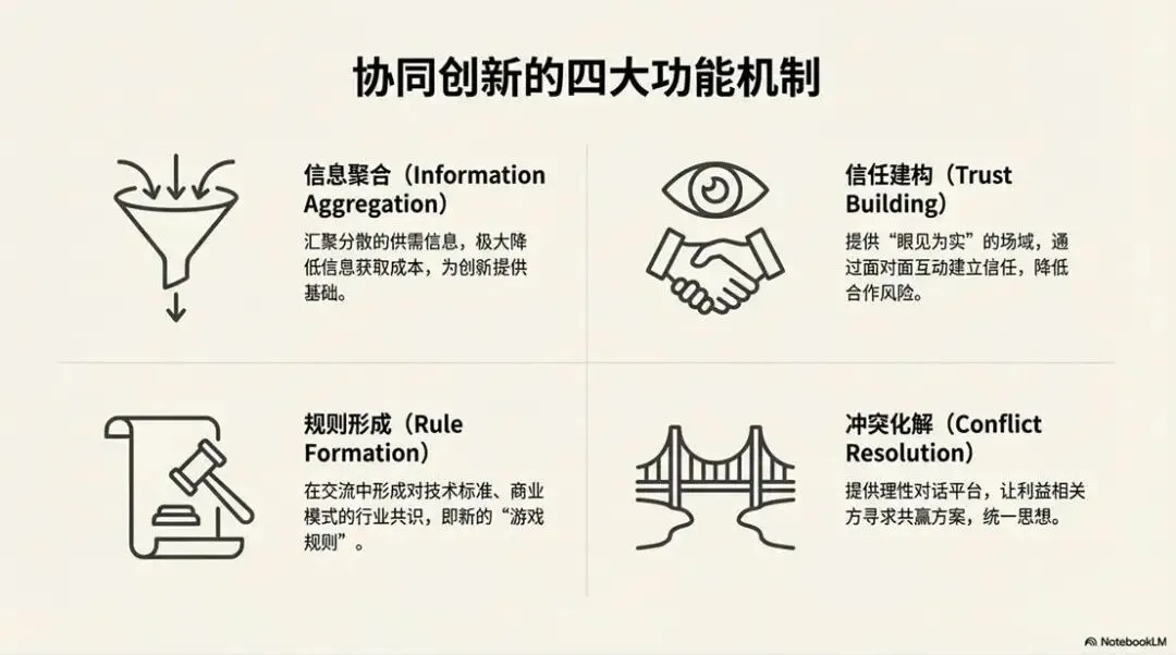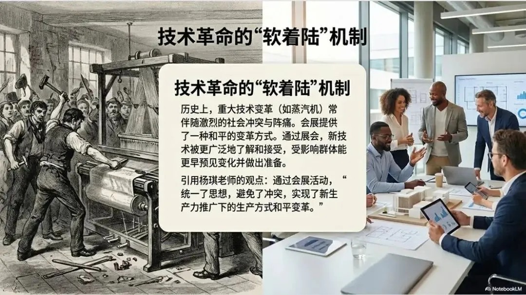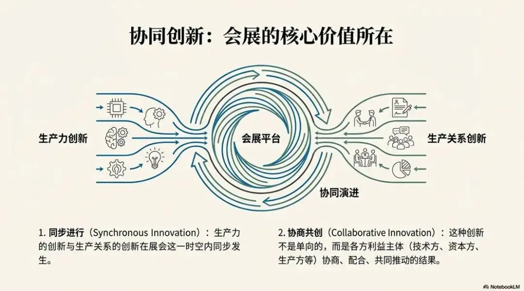 更重要的是,会展不仅展示“硬”的技术和产品,更展示“软”的思想和理念。新的商业模式、新的管理思想、新的发展理念,往往通过展会上的论坛、峰会、研讨会传播开来。这些思想层面的创新,某种意义上是更根本的生产力进步。杨琪老师特别强调:会展活动中的新产品、新技术、新思想是先进生产力的代表。这一判断精准地抓住了会展的核心功能——它是一个让先进生产力得以展示、传播、推广的平台。没有这样的平台,再好的创新也可能“养在深闺人未识”;有了这样的平台,创新就能快速为世人所知,进而转化为现实的生产力。如果说展示先进生产力是会展的“显性”功能,那么促进生产关系调整则是其“隐性”但更为深刻的功能。试想这样一个场景:一家初创企业带着革命性的新技术来到展会,它需要资金支持、需要生产合作伙伴、需要销售渠道。在展会上,它可能遇到感兴趣的投资者、有意合作的制造商、寻求代理的经销商。通过一轮轮的洽谈,各方达成合作意向,签订合作协议。这个过程中发生了什么?从政治经济学的角度看,实际上是在重新配置生产资料、重新安排生产中的相互关系、重新约定产品分配方式——换言之,就是在建立新的生产关系。这正是杨琪老师所指出的:会展活动中的参与各方围绕新产品、新技术、新思想,达成新合作,建立新的协调的生产关系。让我们进一步分析。一项新技术的产业化,往往涉及复杂的利益协调:技术持有者希望获得合理回报,投资者希望控制风险、获取收益,生产商需要确保利润空间,经销商关心市场潜力……各方诉求不同,立场各异。如果没有一个有效的协商机制,很可能陷入僵局,导致好技术无法落地。会展恰恰提供了这样一个协商机制。在这里,各方可以面对面交流,充分表达诉求,寻找利益平衡点。展会期间密集的洽谈、谈判、签约,本质上就是各方围绕新生产力的应用而进行的生产关系重构。这种重构是协商的、和平的、互利的,比起传统的利益博弈方式,效率更高、成本更低、结果更稳定。如果按照制度经济学的观点,这个新质生产力被认知、广泛使用的过程是一种交易成本(类似创新的扩散,需要不同使用者群体的交互和扩散),会展作为一种展示交流的平台可以减少交易成本,促进交流,达成合作。现在,我们可以更深入地理解杨琪老师观点的深刻含义了。会展之所以能够实现这种协同创新,在于它具有几个独特的功能属性。第一,信息聚合功能。会展将分散在社会各处的生产力信息和生产关系信息汇聚到一起,大大降低了各方获取信息的成本。参展商知道买家在哪里,买家知道什么产品最先进,投资者知道哪些技术有前景,求职者知道哪些企业在崛起。这种信息的高度聚合,为协同创新提供了基础条件。第二,信任建构功能。商业合作的前提是信任。会展提供了一个让各方“眼见为实”的场所——产品可以现场演示,企业实力可以直观感受,合作诚意可以当面确认或者通过同行的八卦闲聊间接印证。这种面对面的互动,有助于建立信任,降低合作风险。第三,规则形成功能。每一场行业展会,实际上都在形成和传播行业规则。什么样的技术标准会成为主流?什么样的商业模式受到认可?什么样的合作方式更有效率?这些问题的答案,往往在展会的交流中逐渐形成共识。这种共识,就是新的“游戏规则”,为生产关系的调整提供了依据。第四,冲突化解功能。新技术的推广往往会触动既有利益格局,引发不同群体之间的矛盾。会展提供了一个理性对话的平台,让各方能够充分表达关切,寻求共赢方案。正如杨琪老师所言:通过会展活动,统一了思想,避免了冲突,实现了新生产力推广下的生产方式和平变革。这最后一点尤为重要。历史上,每一次重大的技术变革都伴随着深刻的社会调整,有时甚至引发激烈的社会冲突。蒸汽机的普及曾导致手工业者大规模失业,汽车的兴起曾让马车夫群体消亡。这些变革虽然最终推动了社会进步,但过程中的阵痛是真实的、痛苦的。而会展提供了一种“软着陆”的机制。通过展会,新技术可以被更广泛地了解和接受;- 通过展会,被影响的群体可以更早地预见变化、做出准备;