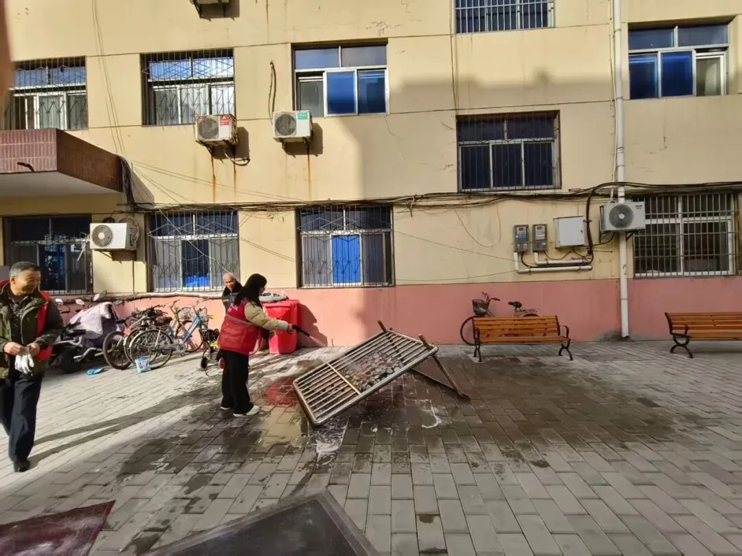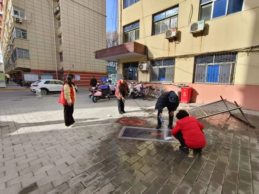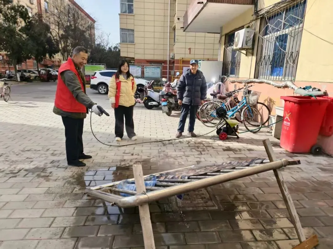 针对居民家中门垫清洗不便的问题,社区特别组织了“爱心冲洗门垫”服务。志愿者们分工协作,帮助居民将厚重的门垫进行清洗、晾晒,让居民的家门口焕然一新。