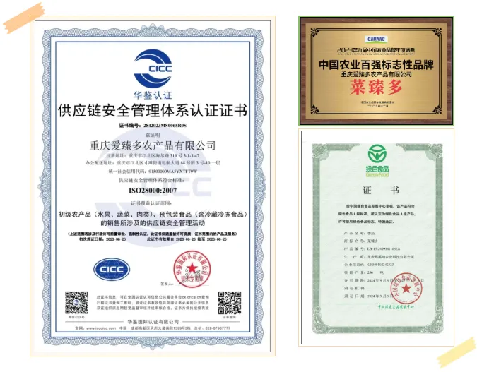 在源头端,4000亩菜臻多农业基地矩阵遍布重庆低中高海拔区域,涪陵龙潭蔬菜公园、武隆高山番茄谷等5大基地各具特色,菜臻多品牌不仅入选中国蔬菜百强,更手握5款绿色食品认证,连华中农大倍味美番茄专利品种都纳入麾下。在流通端,4500方仓储物流配送中心 + 重庆、成都十余个批发中心联动,确保新鲜直达终端。